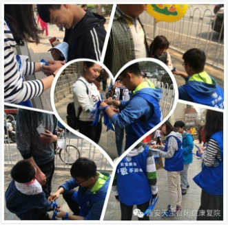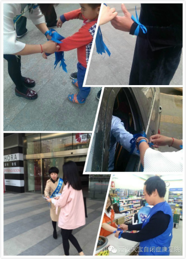 2016年4月2日是第九个世界自闭症日,上午8时,由西安天宝自闭症康复院发起,西安莲湖区残联 汇海青年志愿者联合会 西安印象城 西安每一天便利连锁超市联合主办的“蓝丝带——我的关爱,星儿,你不会孤独”现场发放“感恩蓝丝带”进行自闭症康复知识介绍,全城招募30组困难自闭症家庭,进行一对一家庭咨询和康复训练!”活动在西安印象城,西安每一天便利连锁超市宫园壹号店、龙首北路店、北关正街店、雅荷花园店举行。来自西安天宝的所有特教老师和汇海青年志愿者共同参与此次活动。
