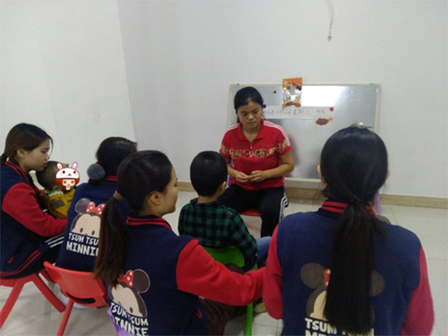 在课堂上由老师带领着孩子,创设一起说话的机会。
